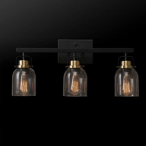 Rockhampton 24 in. 3-Light Matte Black Vanity Light with Matte Brass Accent and Seeded Glass Shades