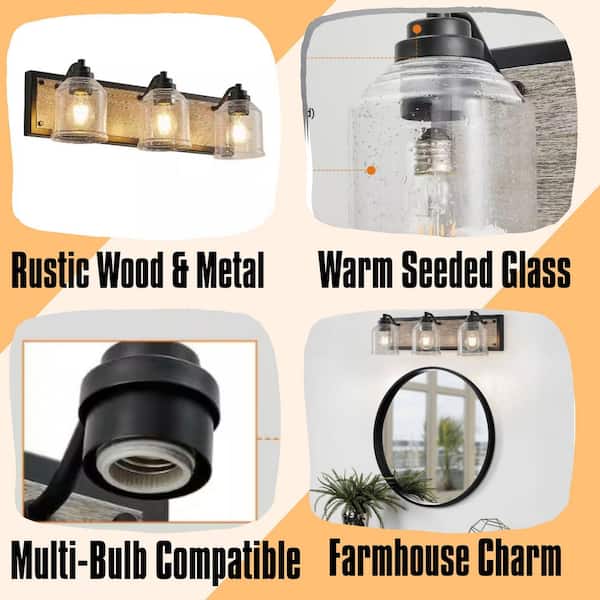 23 in. 3-Light Farmhouse Vanity Light Fixturet Wall Sconce with Seeded Glass Shades,Rustic Black,Wood Backplate,No Bulbs