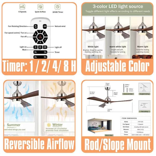 52 in. Indoor Ceiling Fan Light with 3-Wood Blade, Remote Control, 6 -Speed Levels for Bedroom, Stain Nickel Walnut