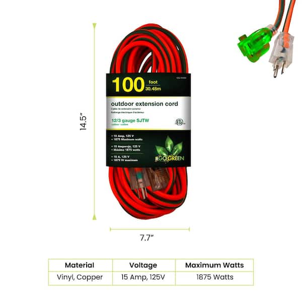 100 ft. 12/3 SJTW Extension Cord - Orange with Lighted Green End