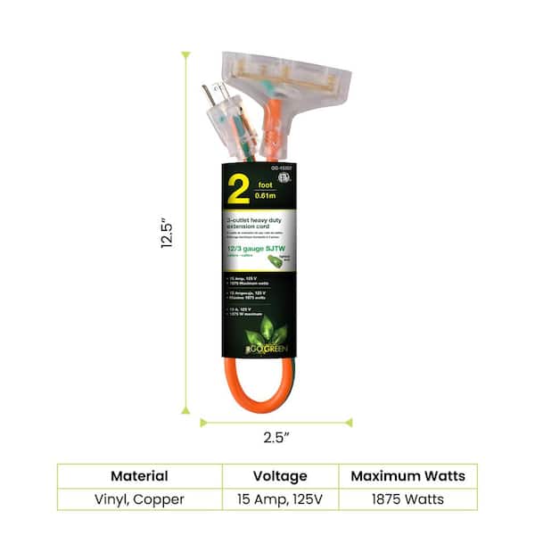 3-Outlet 2 ft. 12/3 Heavy Duty Extension Cord - Orange