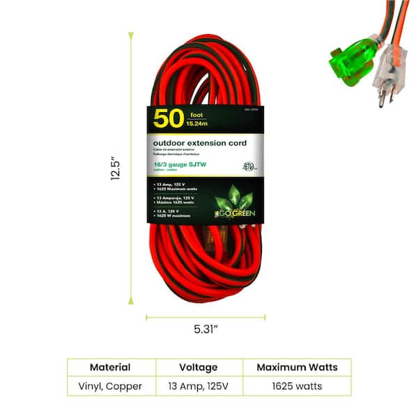 50 ft. 16/3 SJTW Outdoor Extension Cord - Orange with Lighted Green Ends