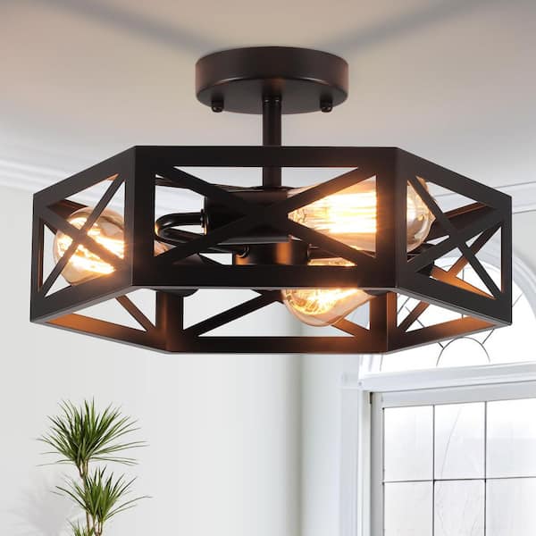 14.57 in. 3-Light Black Modern Industrial Metal Hexagonal Semi-Flush Mount Ceiling Light