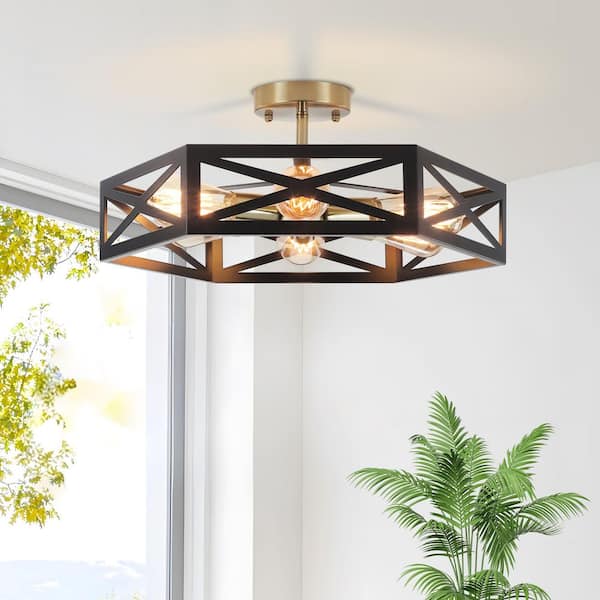 19.69 in. 6-Light Black and Gold Modern Industrial Metal Hexagonal Semi-Flush Mount Ceiling Light
