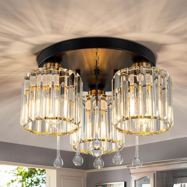 3-Light Black Gold Modern Round Chandelier with Clear Crystal for Dining Room, Kitchen and Entryway