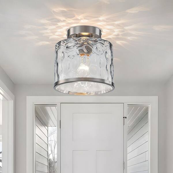 8.07 in. Brushed Nickel Industrial Semi-Flush Mount Ceiling Light with Cylinder Hammer Glass Shade