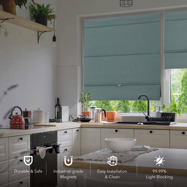 Turquoise No Drill Cordless 99.99% Blackout Natural Woven Magnetic Roman Shades, 35 in. W x 65 in. L
