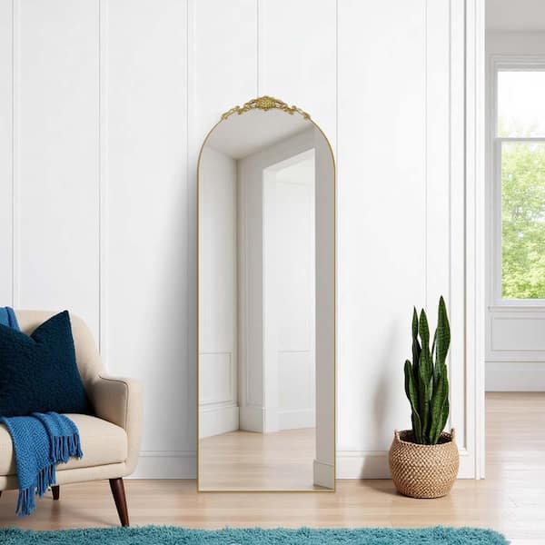 Gold 24 in. W x 65 in. H Wooden Right-Angled Arched Mirror Full-Length Mirror with Stand