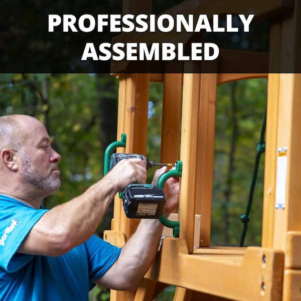 Professionally Assembled Ozark II Kids Wooden Outdoor Playground Set with Slide, Rock Wall, Punching Ball, and Swing set