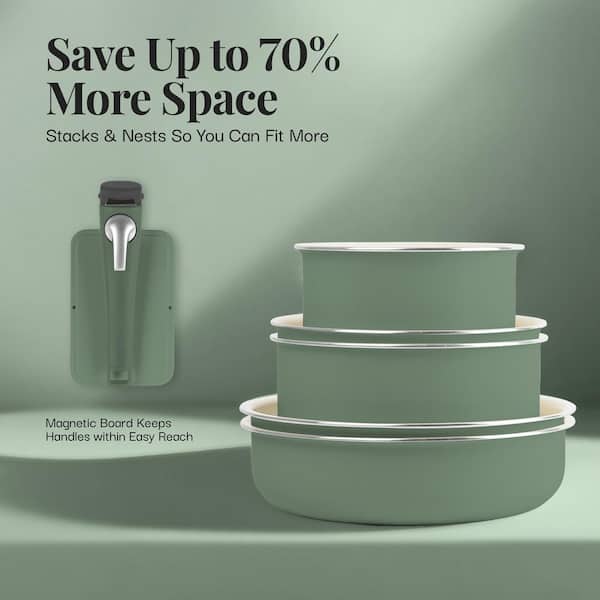 18 Piece Aluminum Ceramic Nonstick Detachable Handle Cookware Set in Sage