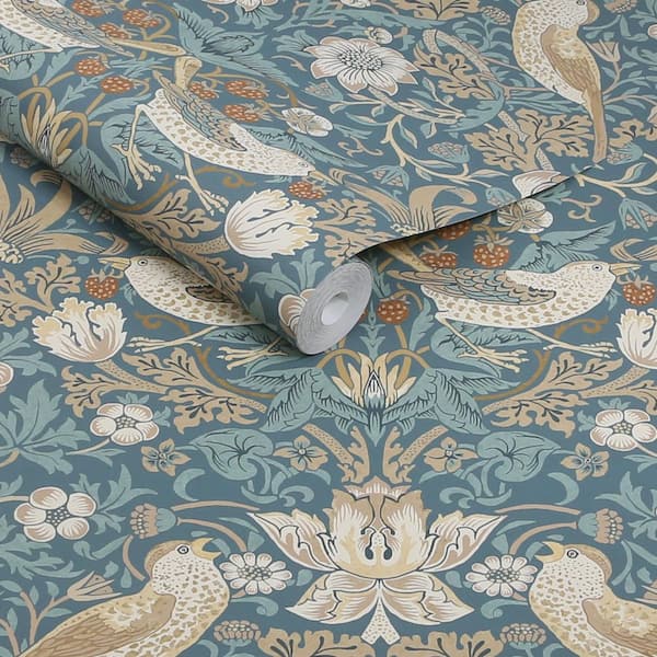 William Morris at Home Strawberry Thief Washed Blue Wallpaper