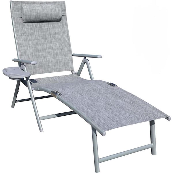 Gray 1-Piece Adjustable Reclining Outdoor Metal Chaise Lounge Aluminum Frame with Cup Holder for Outdoor Patio Beach