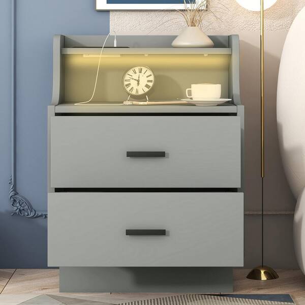 Gray 2 Drawer 13.4 in.W LED Nightstand with 2 USB Charging Station, Wood Nightstand with Color-Changing LED for Bedroom