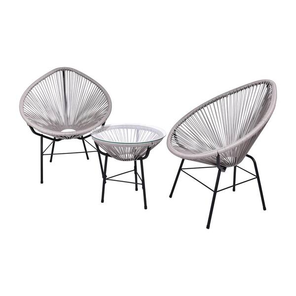 Gray 3-Piece PE Plastic Rattan Outdoor Bistro Set 2 Chairs with Glass Top Coffee Table