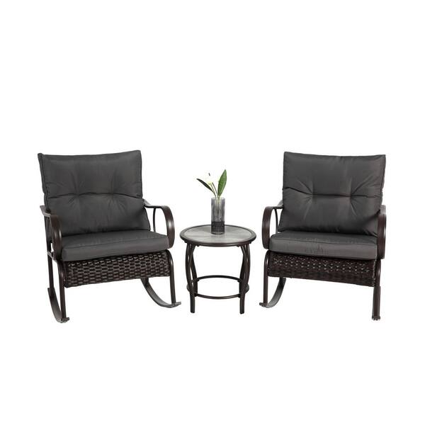 Gray 3-Piece Patio Rattan Metal Rocking Chair Outdoor Furniture Set with Cushions and Coffee Table for Garden