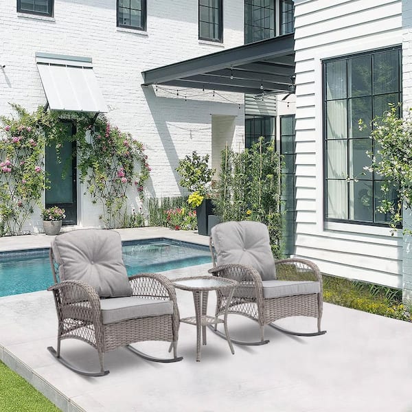 Gray 3-Piece Wicker Outdoor Modern Furniture Rocking Chair Set with Gray Cushion