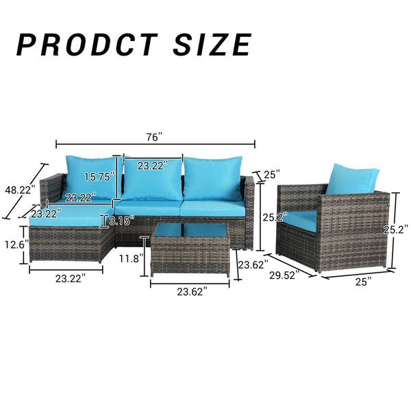 Gray 4-Piece Wicker Outdoor Patio Sectional Set, Rattan Conversation Set with Light Blue Cushions for Backyard Poolside