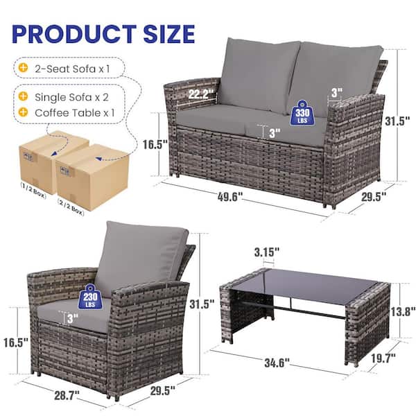 Gray 4-Piece Wicker Outdoor Sofa Sectional Set Conversation Set with Gray Cushions and Tempered Glass Table
