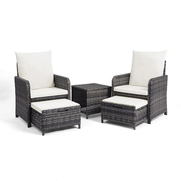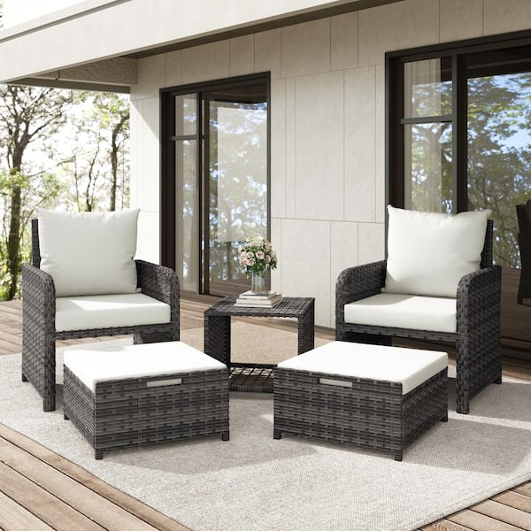 Gray 5-Piece Outdoor Dining Chair Rattan Wicker Patio Conversation Sofa Ottoman and Table Set with Beige Cushions