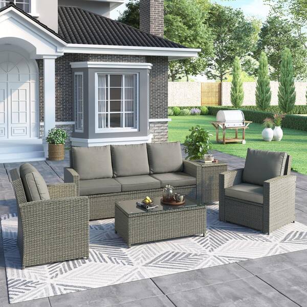 Gray 5-Piece Wicker Patio Conversation Set with Gray Cushions and Tables