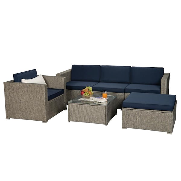 Gray 6-Piece Patio Furniture Outdoor PE Rattan Wicker Conversation Set Sofa Set w/Table, Ottoman, Navy Blue Cushion