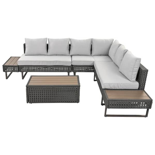 Gray 6-Piece Wicker Outdoor Sectional Set with Gray Cushions and Extendable Coffee Table