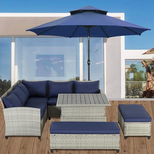Gray 6-Piece Wicker Patio Conversation Set with Blue Cushions, Lifting Coffee Table and Ottoman