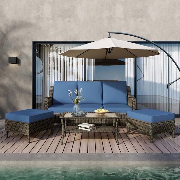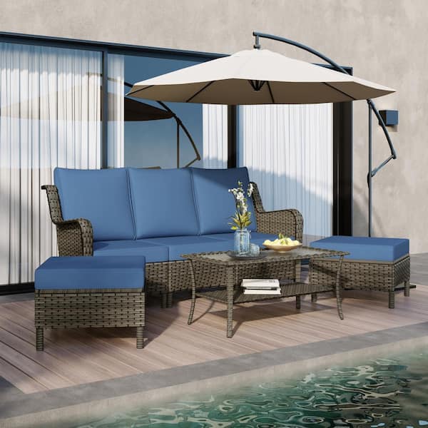 Gray 6-Piece Wicker Rattan Patio Conversation Outdoor Sectional Sofa and Coffee Table, Ottoman Set with Blue Cushions