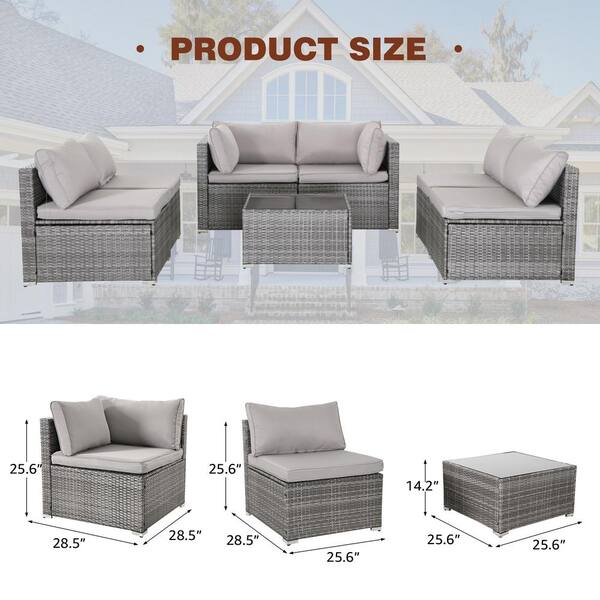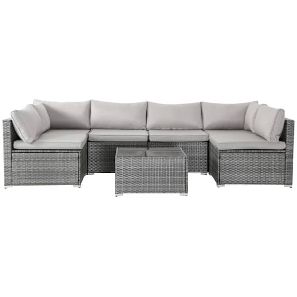 Gray 7-Piece PE Wicker Patio Conversation Set with Gray Cushions