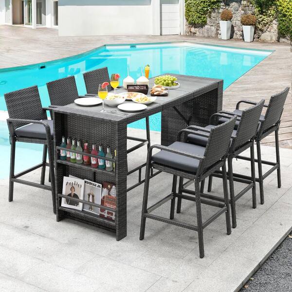 Gray 7-Piece PE Wicker Rectangular Bar Height Outdoor Serving Bar Set Patio Dining Set with Dark Gray Cushions