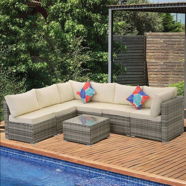 Gray 7-Piece Rattan Sectional Garden Furniture Corner Sofa Set with White Cushions