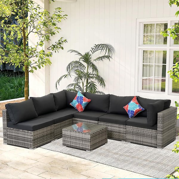 Gray 7-Piece Wicker Outdoor Patio Conversation Set with Dark Gray Cushion, Glass Table and Pillow