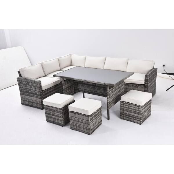 Gray 7-Piece Wicker Outdoor Sectional Sofa Set, Patio Conversation Set with Dining Table, Ottomans and Beige Cushions