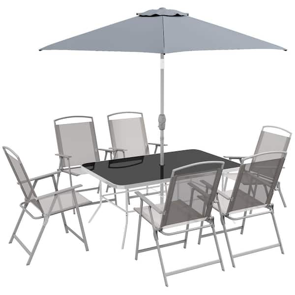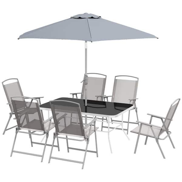 Gray 8-Piece Metal Outdoor Dining Set with Table Umbrella, 6 Folding Chairs and Rectangle Dining Table Set for Patio