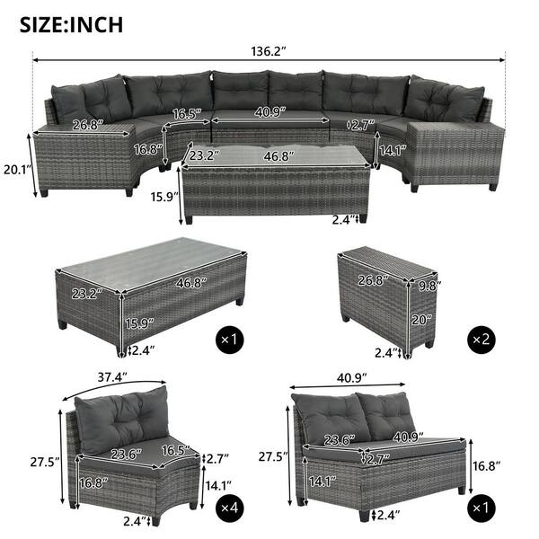 Gray 8-Piece Wicker Outdoor Sectional Sofa Set, All Weather Patio PE Rattan Conversation Set with Gray Movable Cushion