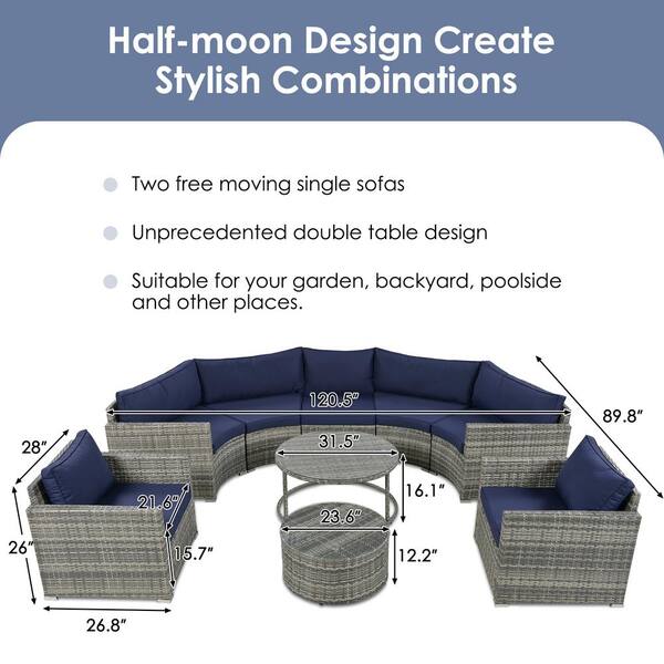 Gray 9-Piece Wicker Half-moon Outdoor Sectional Set, Modern Style Round Patio Conversation Set with Blue Cushions