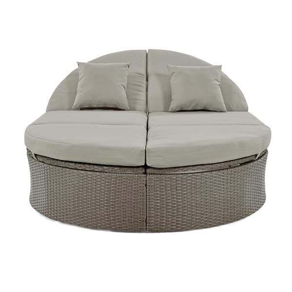 Gray Composite Outdoor Sun Bed Patio 2-Person Day Bed with Cushions and Pillows, Rattan Garden Reclining Chaise Lounge