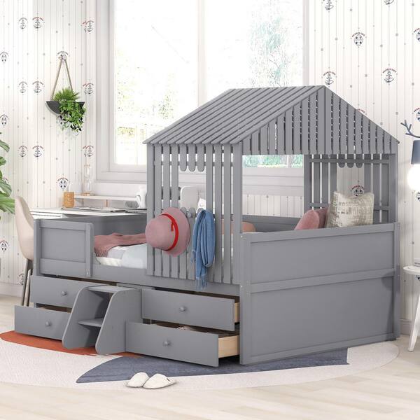 Gray Full Size House Low Loft Bed with Four Drawers, Wooden Bed Frame with Roof & Windows for Kids