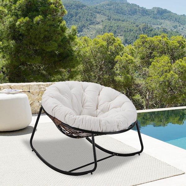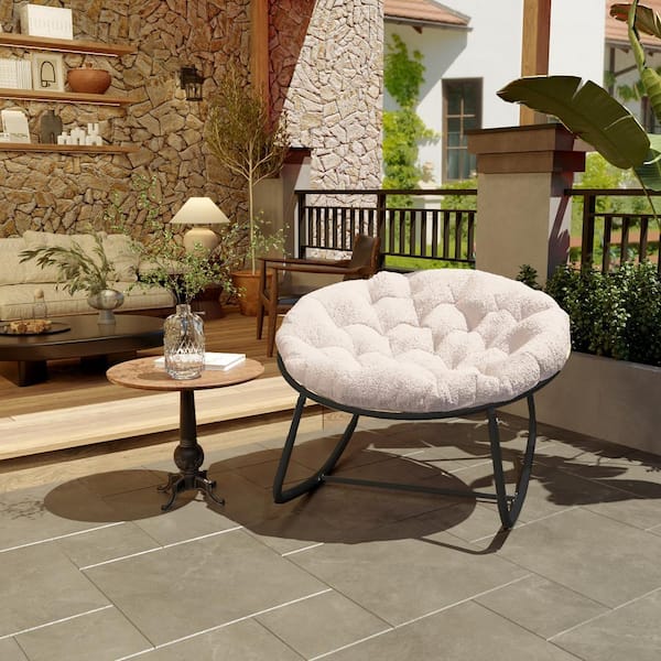 Gray Metal Round Outdoor Rocking Chair with Beige Teddy Cushion