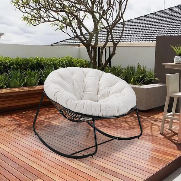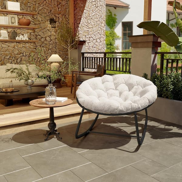 Gray Metal Round Outdoor Rocking Chair with White Teddy Cushion