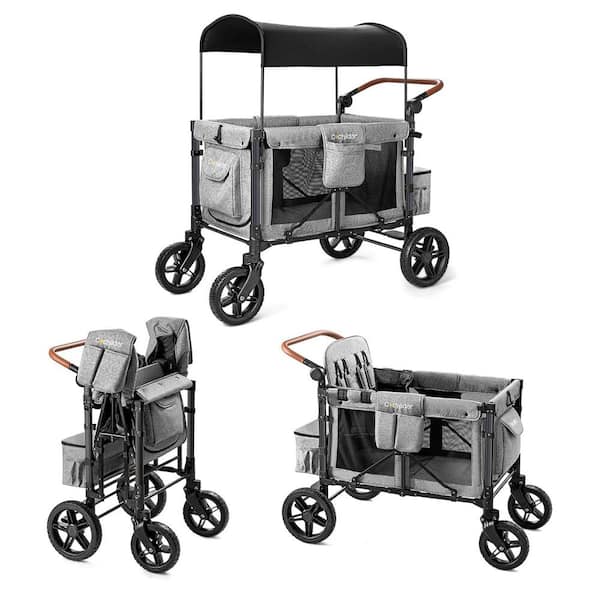 Gray Metal Stroller Wagon with Removable Canopy and Adjustable Pull Handles