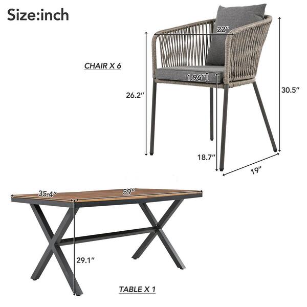 Gray Rope 7-Piece Metal Outdoor Dining Set, All-Weather Dining Table and Chairs with Gray Cushion for Garden, Patio