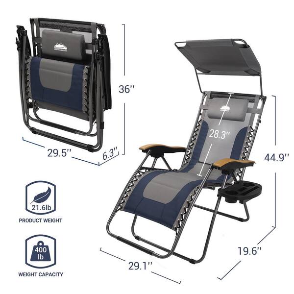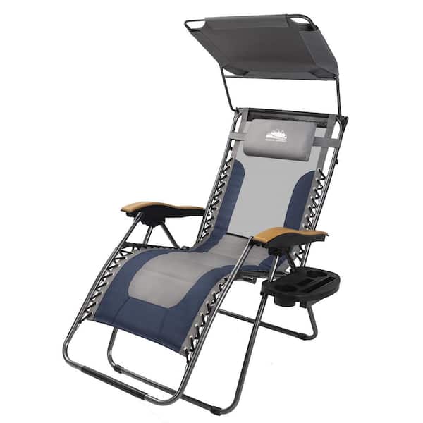 Gray Steel Outdoor Zero Gravity Reclining Lounge Chair with Adjustable Sun Shade and Navy Cushion
