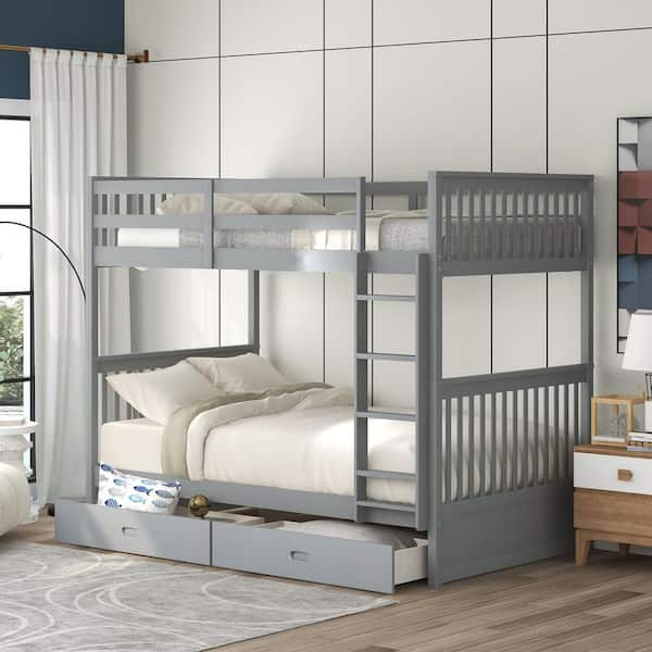 Gray Twin-Over-Twin Bunk Bed with Ladders and 2 Storage Drawers