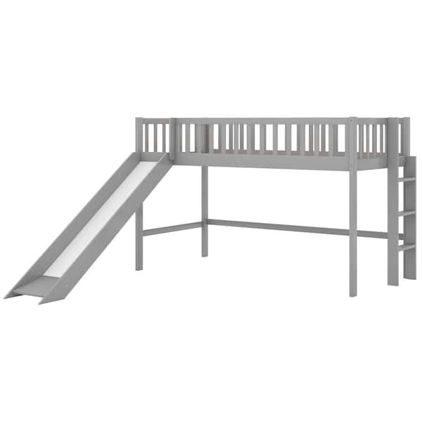 Gray Twin Size Low Loft Bed with Slide, Full Length Guardrail, and Built-in Ladder