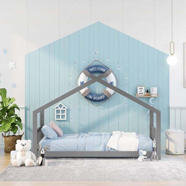 Gray Twin Size Wood House Bed with Roof,Twin Platform Bed with Headboard and Footboard,No Box Spring Needed