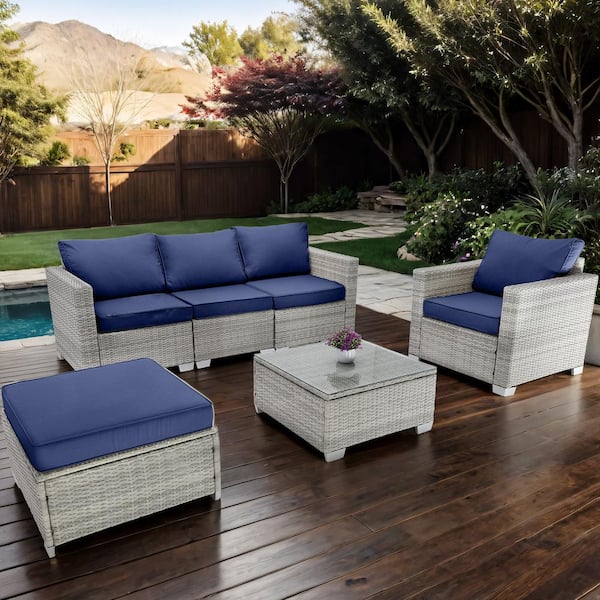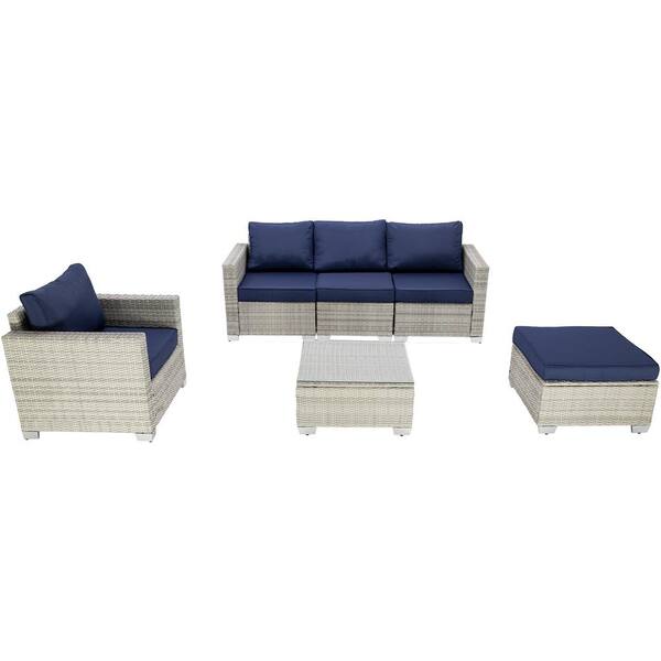 Gray White 6-Pieces Wicker Outdoor Fabric Sofa Sectional Set with Dark Blue Cushions