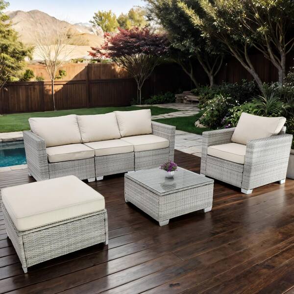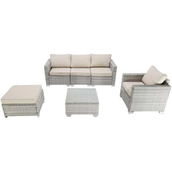 Gray White 6-Pieces Wicker Outdoor Fabric Sofa Sectional Set with Field Gray Cushions