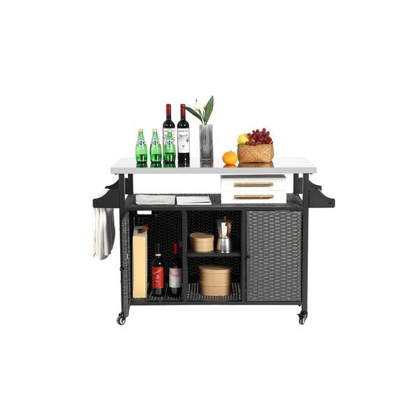 Gray Wicker Outdoor Serving Cart with Storage Cabinet, Wheel, Stainless Steel Extended Table Top and Side Handle