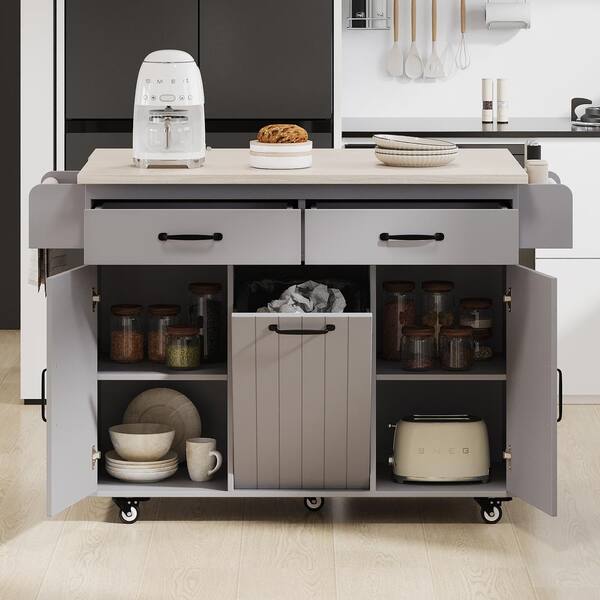 Gray Wood 51.06 in. Rolling Kitchen Island with Drop Leaf and Adjustable Shelf